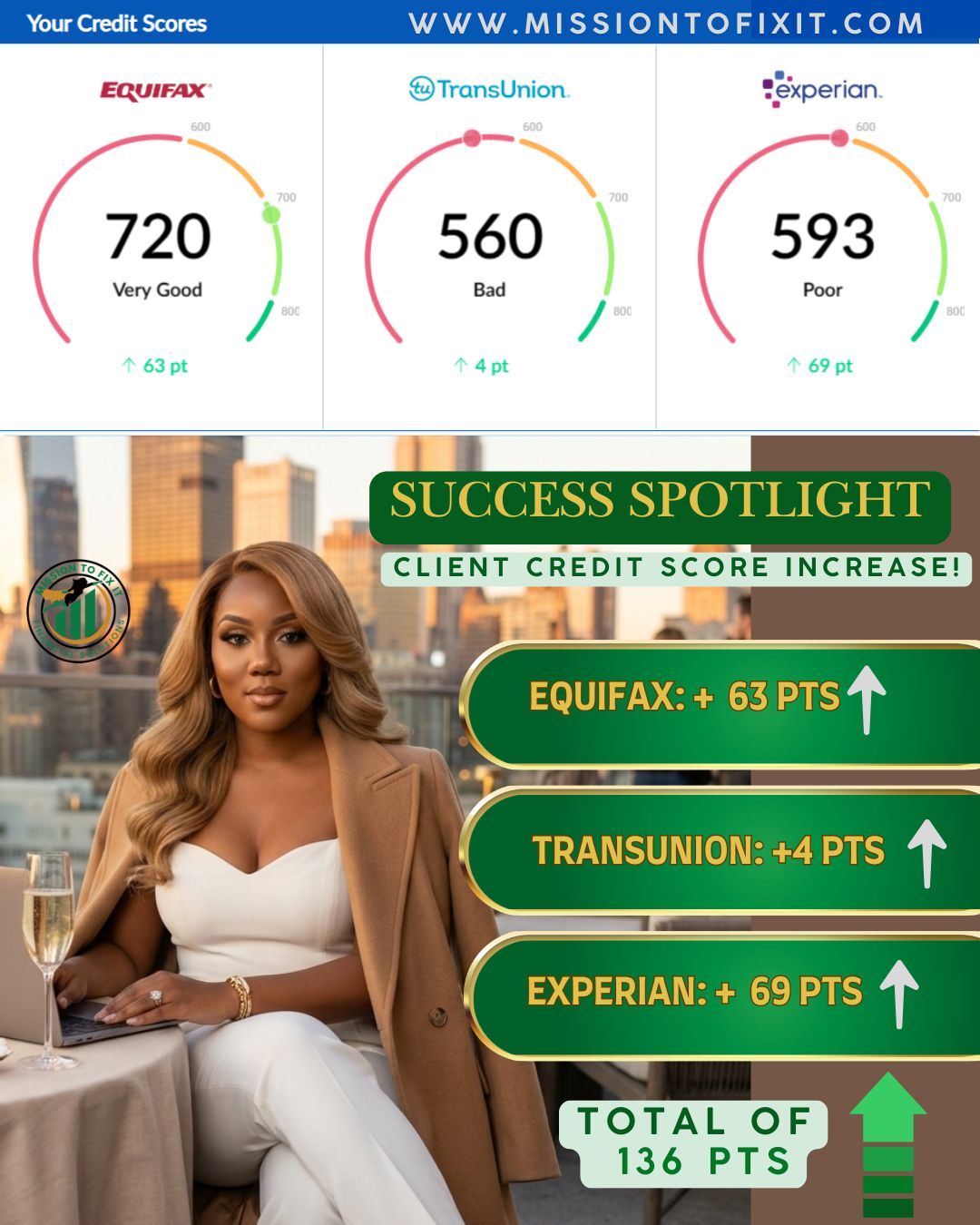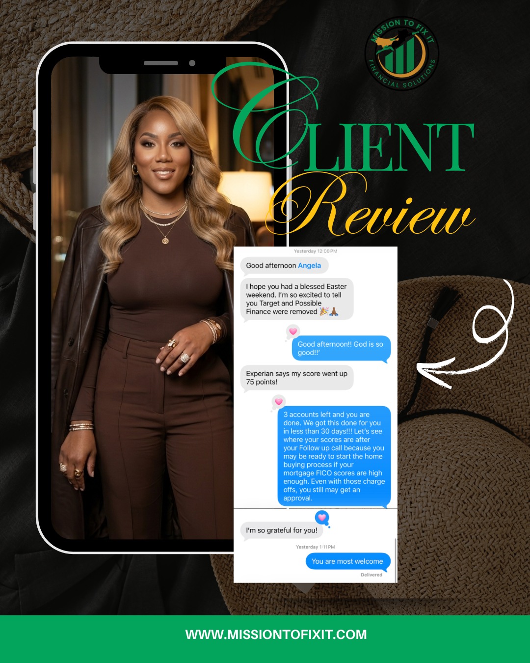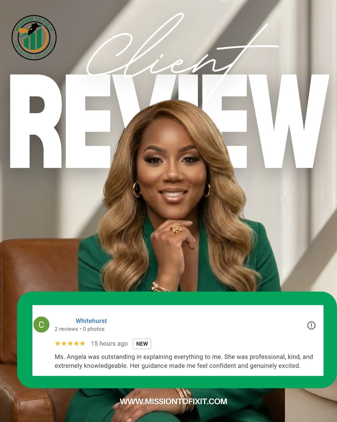 If you have credit issues Mission To Fix It is the way to go. I received great service from Ms Angela from beginning to end. She not only repaired my credit but she educated me throughout the process. This company is way better than any other company I have utilized in the past. COMMUNICATION was GREAT! I received results within the first month and I was able to complete and graduate before 90 days. I highly recommend.