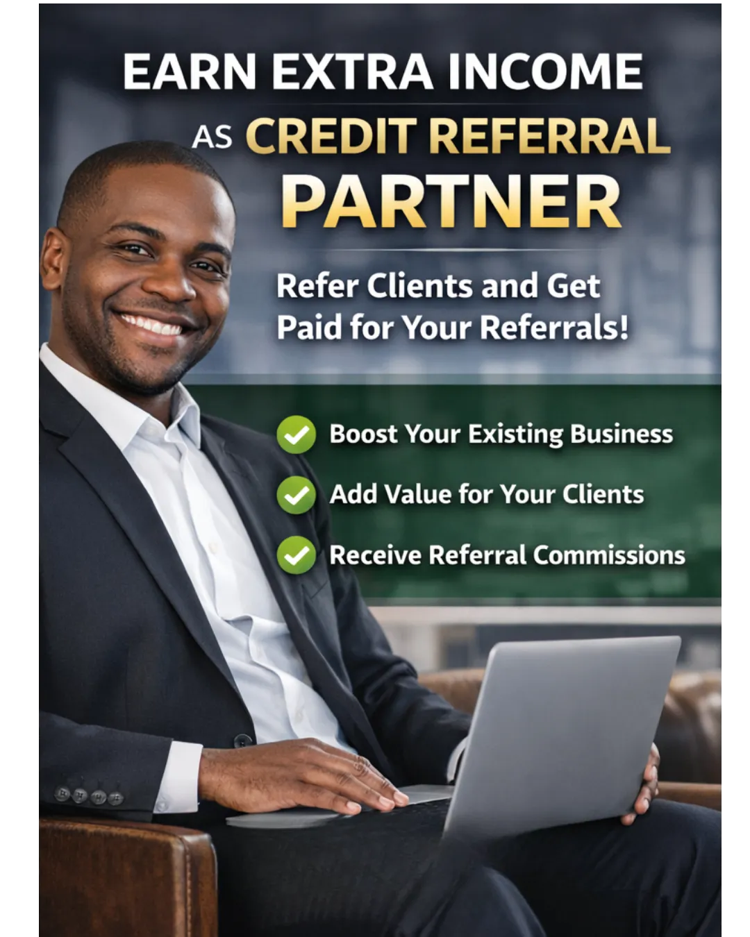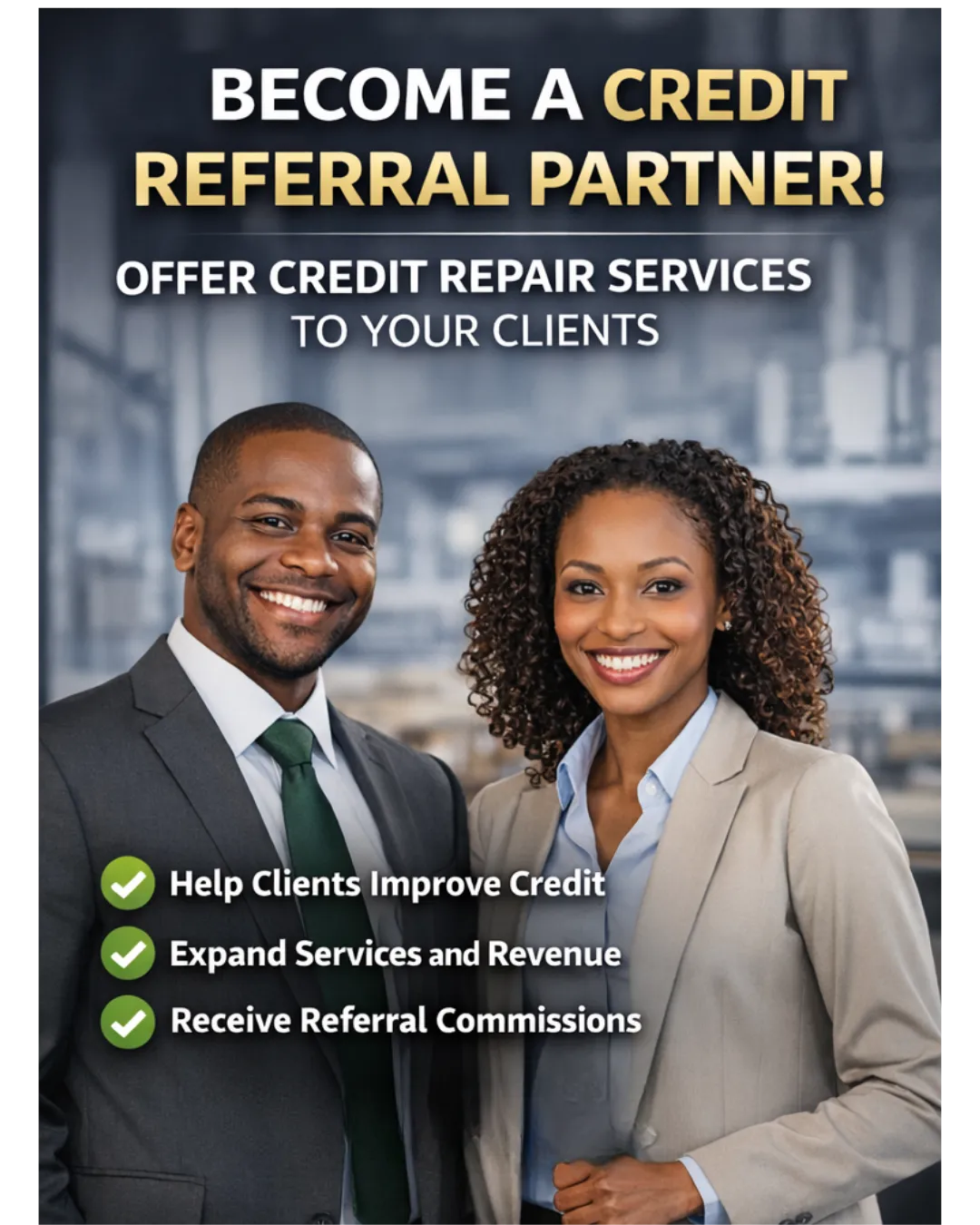 Our partner program is open to professionals and businesses who serve clients that may benefit from credit repair support. This may include realtors, mortgage professionals, tax professionals, insurance agents, business consultants, and other service-based professionals.