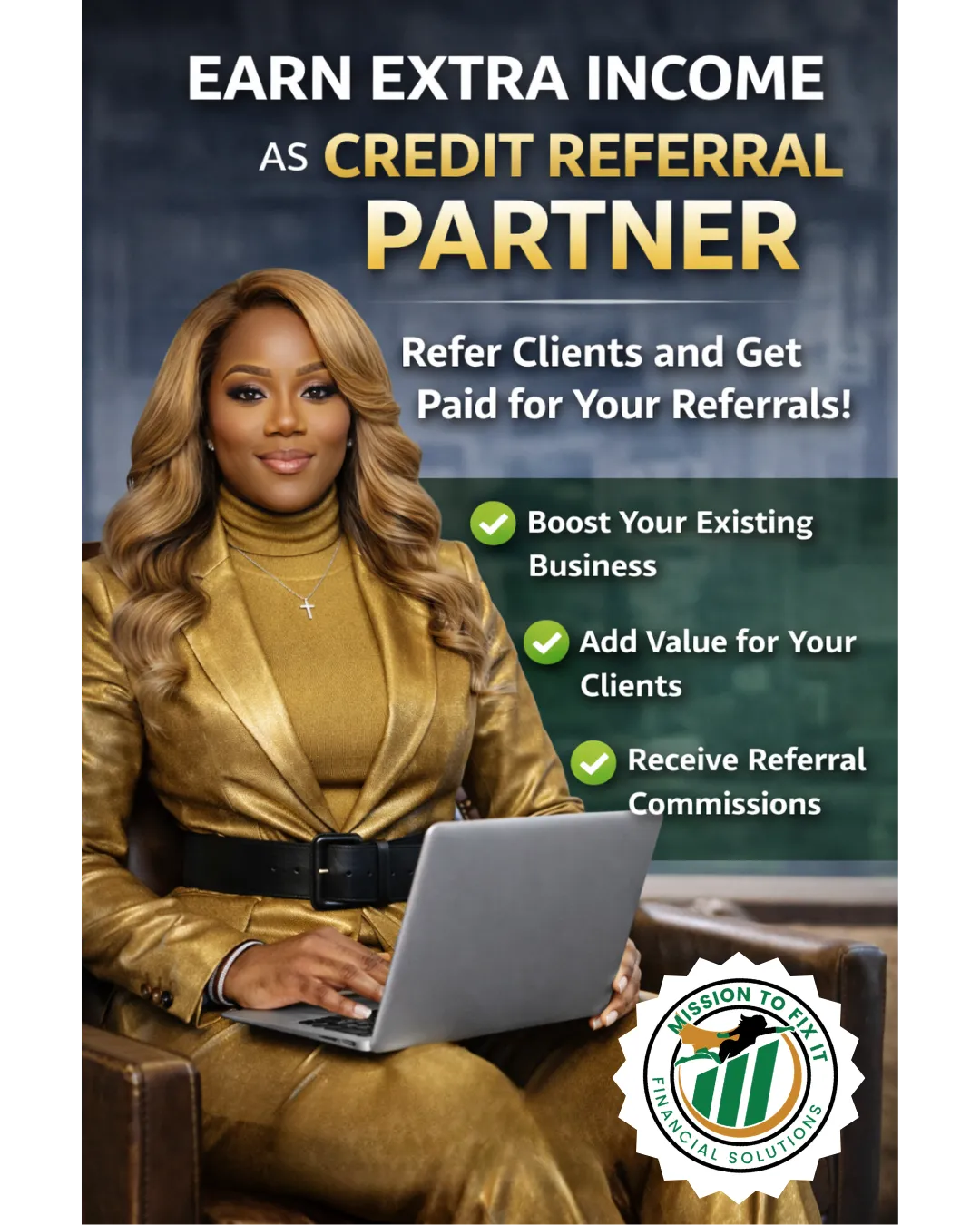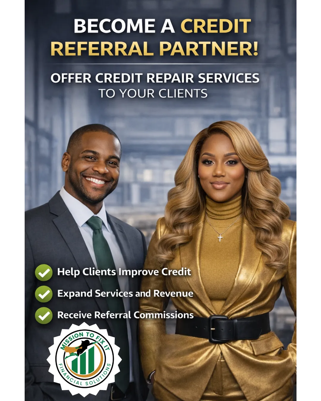 Mission to Fix It Financial Solutions partners with professionals to help clients overcome credit challenges and become funding-ready. With a transparent referral process, real-time updates, and proven strategies, we help you turn denied clients into approved opportunities, while enhancing your service and growing your income.